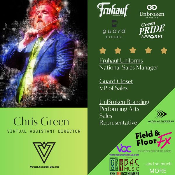 Some of the other organizations Chris has served in Administrative or Teaching roles include: Richmond Men's Chorus. Richmond Pop's Band, Richmond Choral Society, Adamson High School, Hickory Grove Baptist Church Orchestra, Blue Stars Drum & Bugle Corps, Memphis Sound Drum & Bugle Corps, Forte Drum & Bugle Corps, Heat Wave Drum & Bugle Corps, YMCA Musical Theater Camps, St Petersburg Opera Company, Theater Tampa Bay, Association of Concert Bands, Pride Bands Alliance, Texas Drum Corps Preview Show, Gay Games (Valencia, Spain) and many more